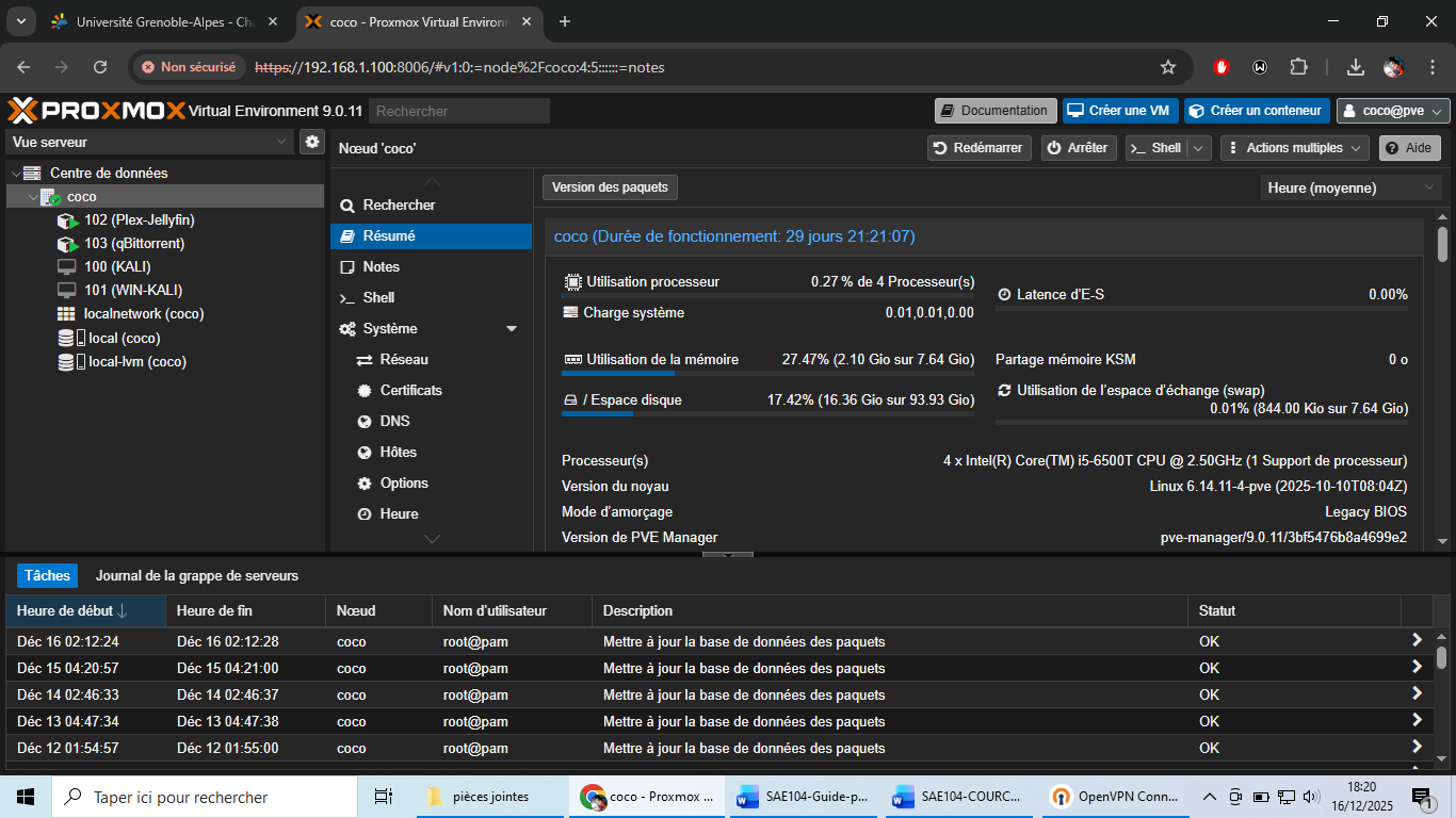 J’ai récupéré un ancien PC de l’IUT1 que j’ai transformé en véritable serveur personnel. Après une mise à niveau de la RAM, j’ai installé Proxmox entièrement en ligne de commande, puis j’ai créé plusieurs machines virtuelles afin de simuler un environnement réseau complet.